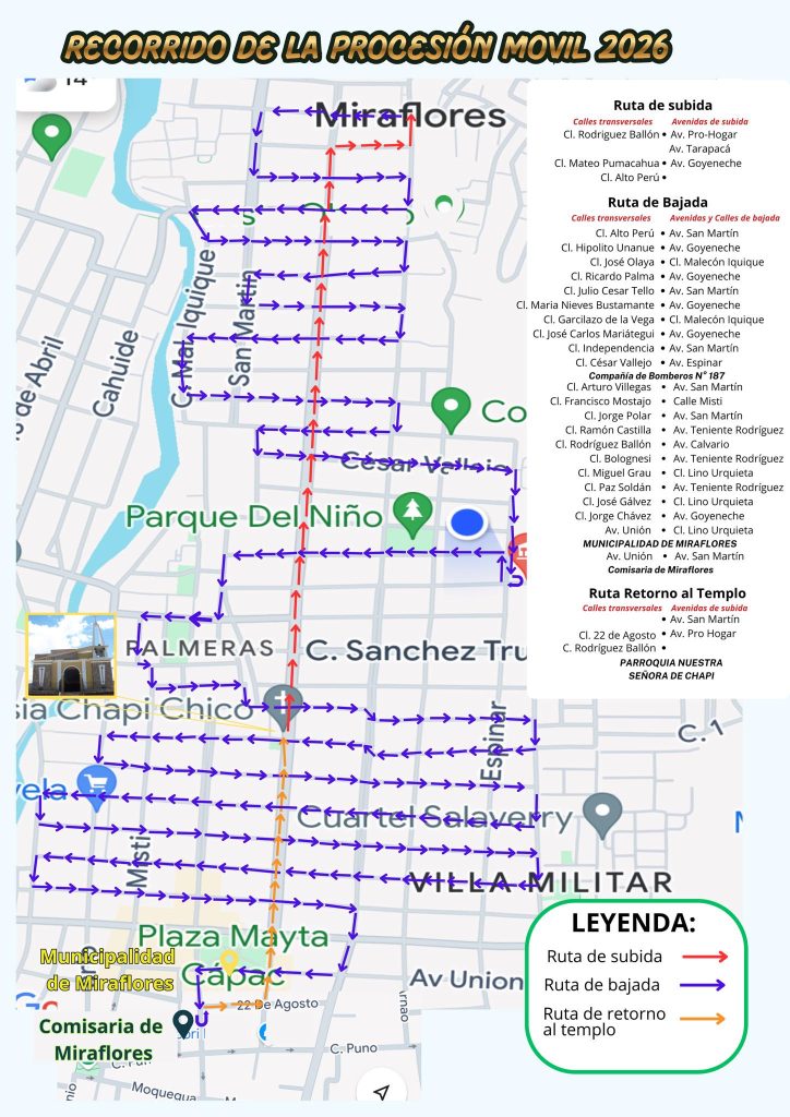 Las actividades iniciarán el domingo 26 de abril con una procesión móvil que partirá desde las calles Alto Perú y recorrerá diversas vías del distrito de Miraflores. Ese mismo día se celebrará una misa desde las 6:30 a. m., seguida de la procesión a las 7:30 a. m., que llegará hasta la municipalidad y contará con homenajes de instituciones locales, para luego retornar al templo donde se oficiará una misa por la tarde.