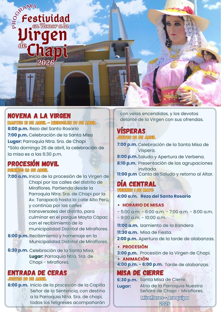 La devoción a la “Mamita de Chapi” ya se vive en Arequipa. La parroquia de Chapi Chico, en el distrito de Miraflores, presentó el programa oficial de actividades por la festividad en honor a la Santísima Virgen de Chapi, que congregaría entre 4 mil y 5 mil fieles, e incluso más, según estimaciones del párroco Julio Herrera Monmontoy.