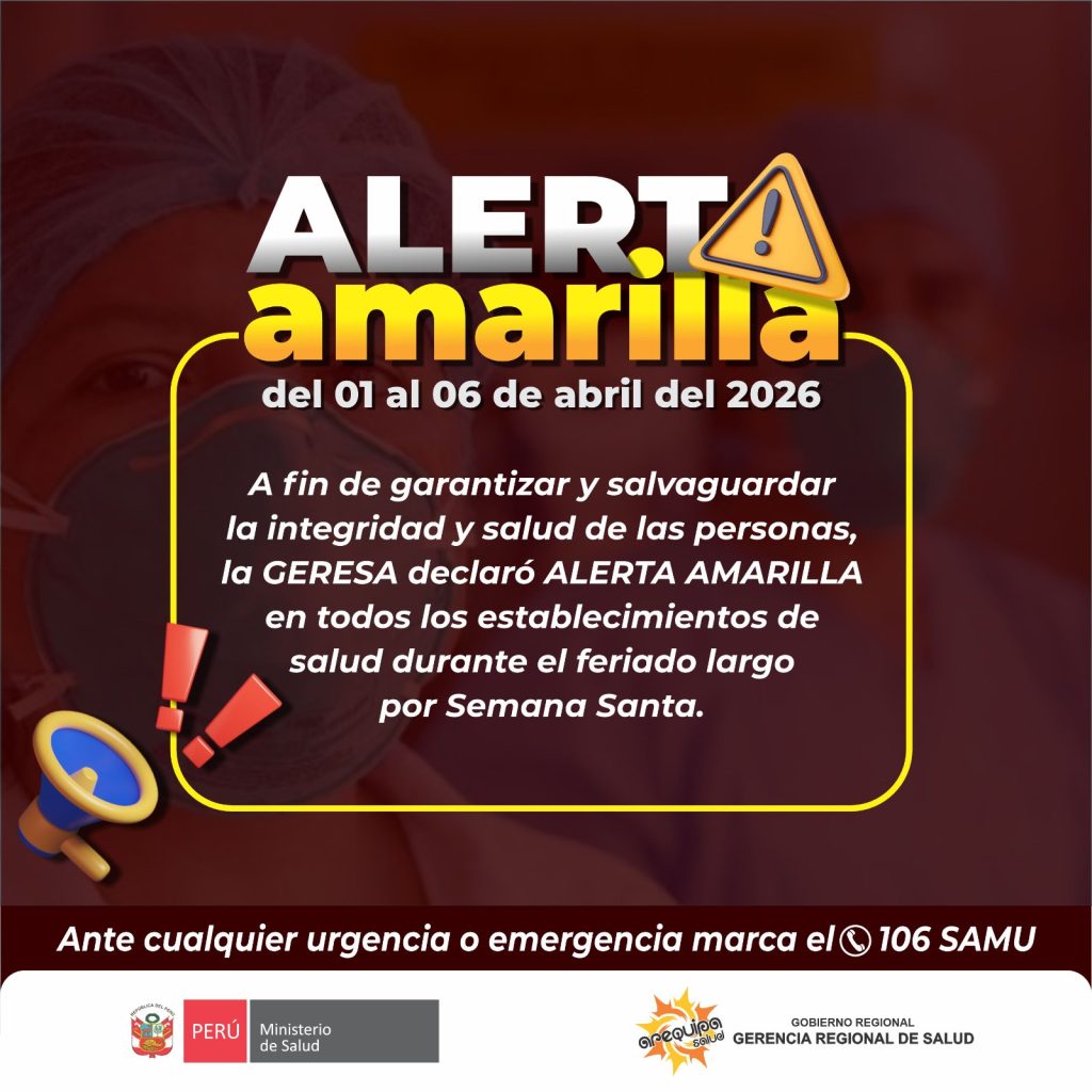 El Gobierno Regional de Arequipa, a través de la Gerencia Regional de Salud (GERESA), ha dispuesto la declaratoria de Alerta Amarilla en los 254 establecimientos de salud de la región, con el objetivo de fortalecer la capacidad de respuesta del sistema sanitario ante el incremento de riesgos asociados al feriado largo.
